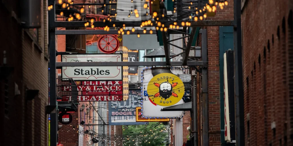 If you’re looking for a place that combines history, great food, and live music under one neon glow, Printers Alley is a must-visit destination in Nashville.